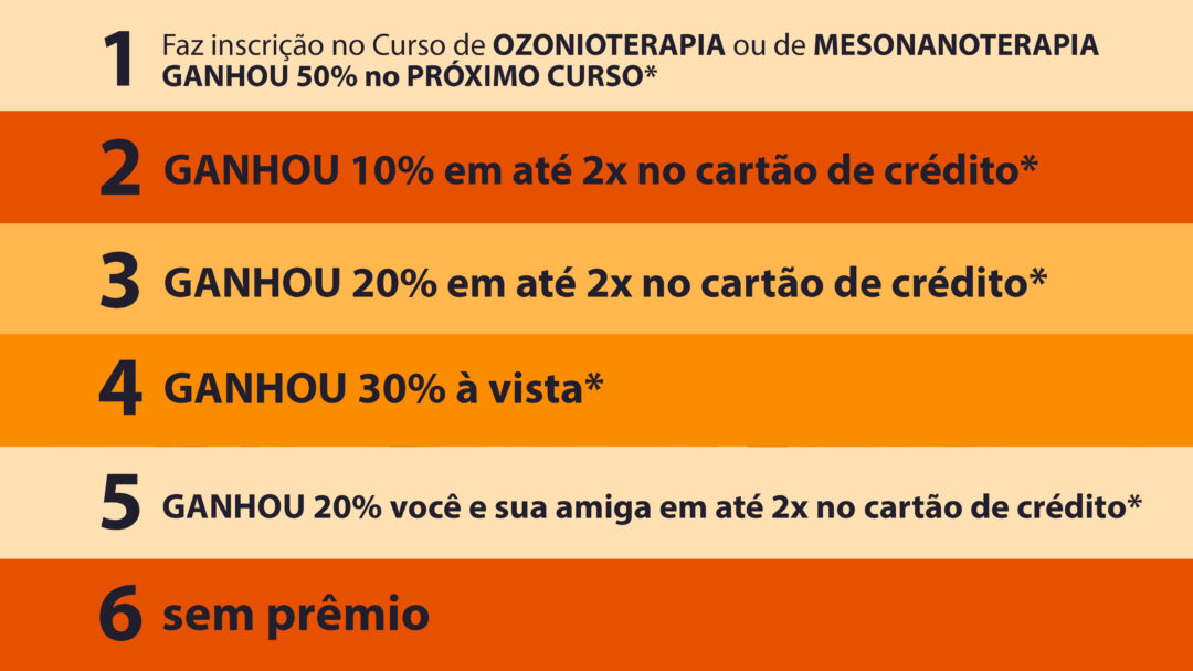 22/05 – Curso de OZONIOTERAPIA APLICADO NA ESTÉTICA – 9:00-17:00 – aprenda as técnicas de aplicação na estética, a legislação e seus limites principalmente em técnicas injetáveis, a história da ozonioterapia e seus preceitos dentro do contexto mundial, as dosimetrias específicas para cada tipo de tratamento celulite, gordura localizada, estrias, rugas, marcas de expressão, flacidez tissular e flacidez muscular, clareamento, emagrecimento, capilar e anti aging rejuvenescimento.