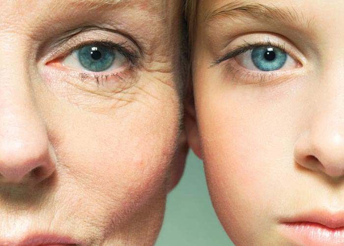 45 aos 55 anos: As fibras de colágeno ficam ainda mais entrelaçadas e ricas em colágeno insolúvel, a pele torna-se flácida porque também as fibras de elastina não conseguem manter as tensões necessárias ao bom funcionamento da pele. Os melanócitos reduzem a produção em mais de 80%.